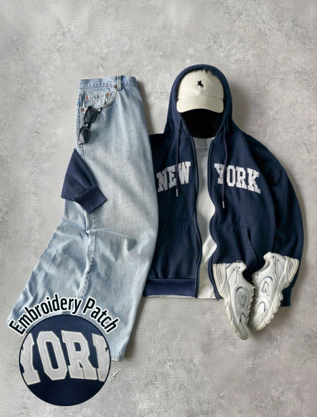 طرح تایپوگرافی «New York» به صورت چاپ یا دوخت آپلیکه و گلدوزی (Appliqué & Embroidery) روی قسمت جلویی، که جلوهای ویژه و مدرن به لباس میبخشد.